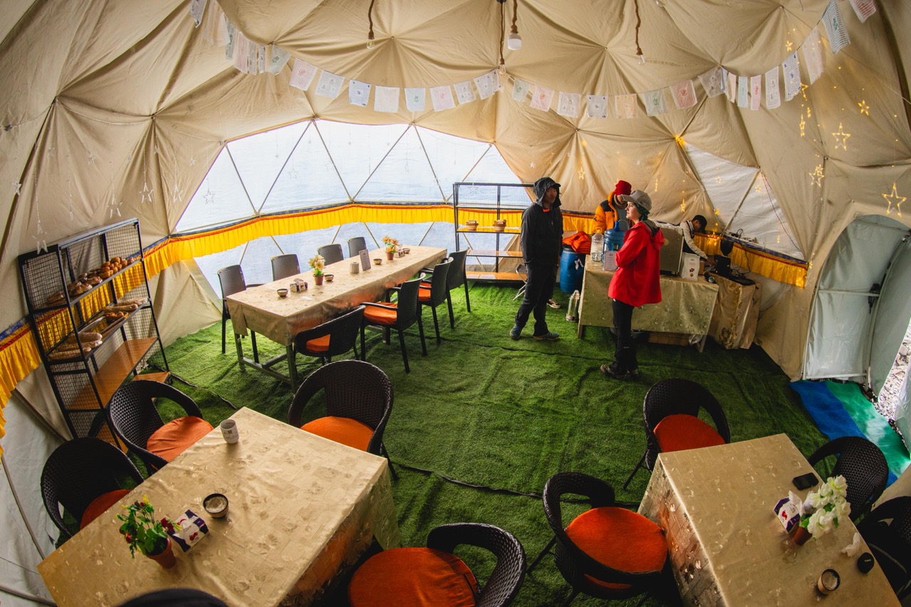 3 meals a day (breakfast, lunch, dinner, tea, and coffee) and accommodation at hotel/lodge during the trek and at Base Camp, including fresh vegetables, meat, fruits, and soft drinks. Well-managed Base Camp setup.